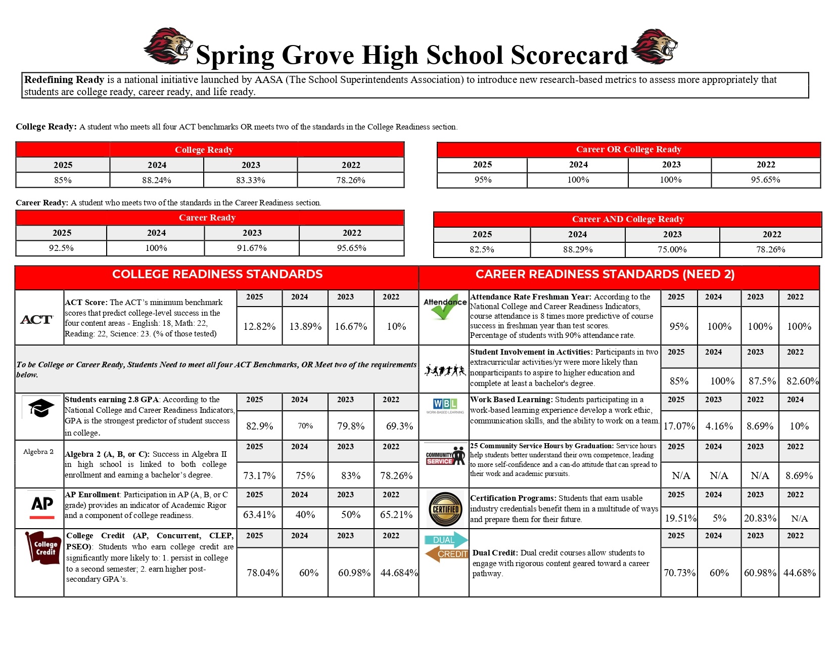 Redefining Ready Spring Grove is going schools from across the nation in looking at what skills, knowledge, dispositions, and skills our students need to graduate. This movement was sparked by the National Superintendent Association by creating National College and Career Readiness Indicators. This Redefining Ready movement has been growing in support, research and action throughout the nation. Spring Grove has been meeting with seniors about these indicators to help prepare them for their next steps for over five years. Now, we are adding more goals to support our effort to Redefine Ready:
